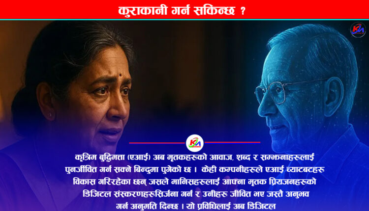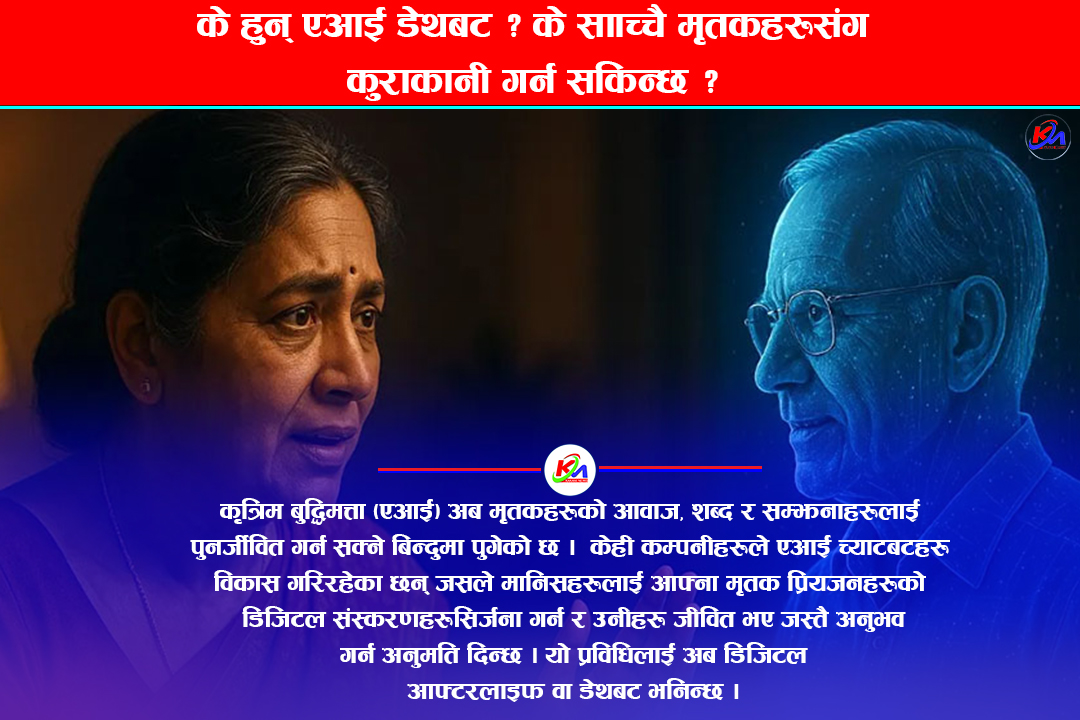 काठमाडौँ । कृत्रिम बुद्धिमत्ता (एआई) अब मृतकहरूको आवाज, शब्द र सम्झनाहरूलाई पुनर्जीवित गर्न सक्ने बिन्दुमा पुगेको छ । हो, तपाईंले सही सुन्नुभयो ! केही कम्पनीहरूले एआई च्याटबटहरू विकास गरिरहेका छन् जसले मानिसहरूलाई आफ्ना मृतक प्रियजनहरूको डिजिटल संस्करणहरू सिर्जना गर्न र उनीहरू जीवित भए जस्तै अनुभव गर्न अनुमति दिन्छ । यो प्रविधिलाई अब ‘डिजिटल आफ्टरलाइफ’ वा ‘डेथबट’ भनिन्छ ।