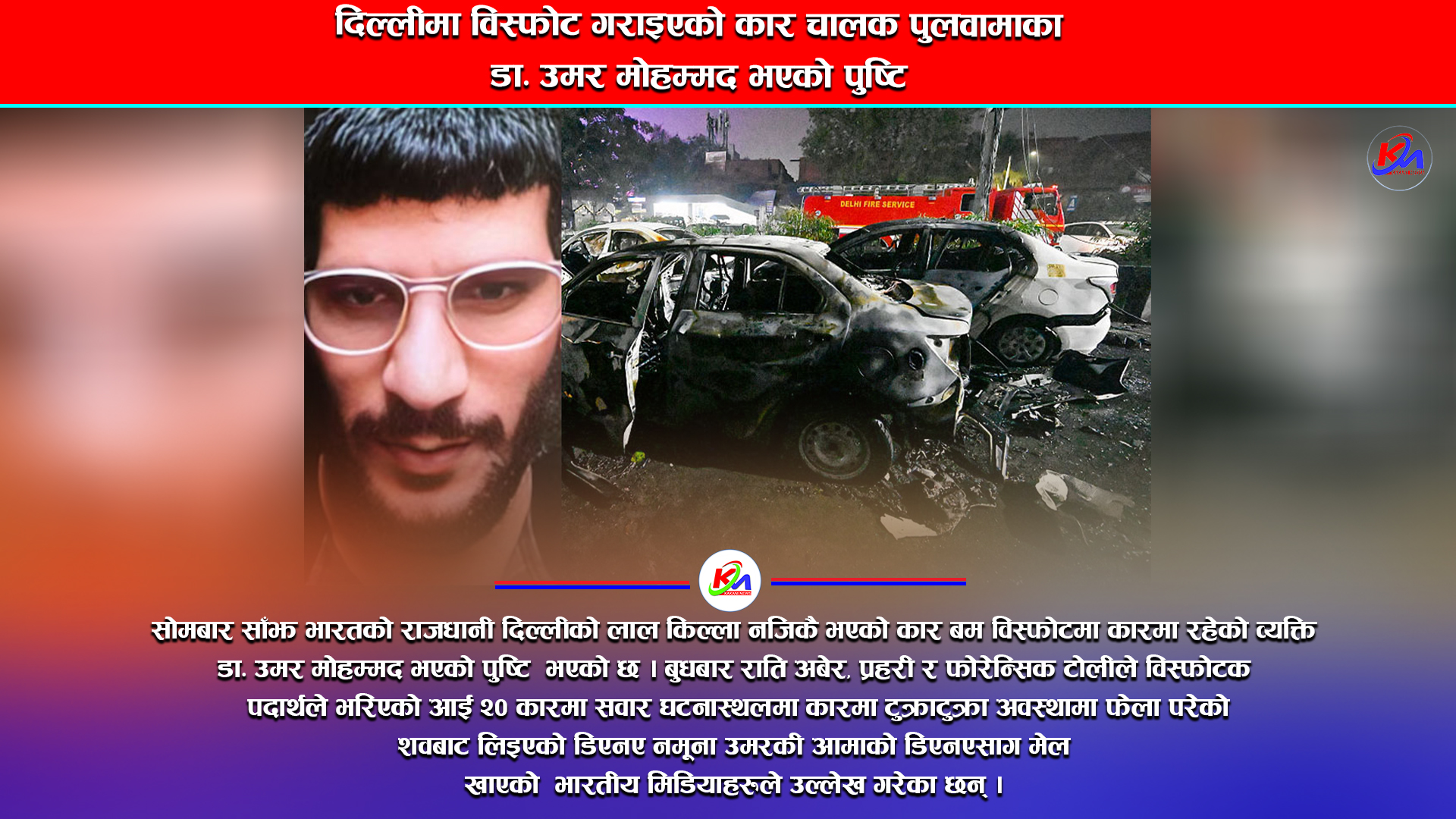 काठमाडौँ । सोमबार साँझ भारतको राजधानी दिल्लीको लाल किल्ला नजिकै भएको कार बम विस्फोटमा कारमा रहेको व्यक्ति डा. उमर मोहम्मद भएको पुष्टि  भएको छ । डिएनए परिक्षणबाट कारमा रहेका डा. उमर मोहम्मद भएको पुष्टि भएको हो । बुधबार राति अबेर, प्रहरी र फोरेन्सिक टोलीले विस्फोटक पदार्थले भरिएको आई २० कारमा सवार घटनास्थलमा कारमा टुक्राटुक्रा अवस्थामा फेला परेको शवबाट लिइएको डिएनए नमूना उमरकी आमाको डिएनएसँग मेल खाएको भारतीय मिडियाहरुले उल्लेख गरेका छन् ।