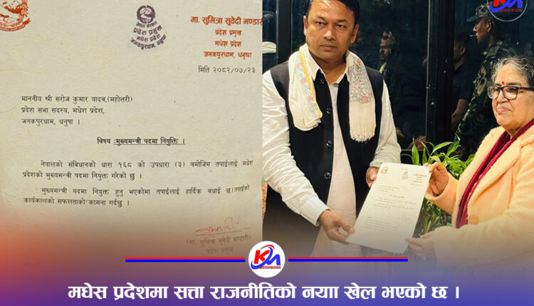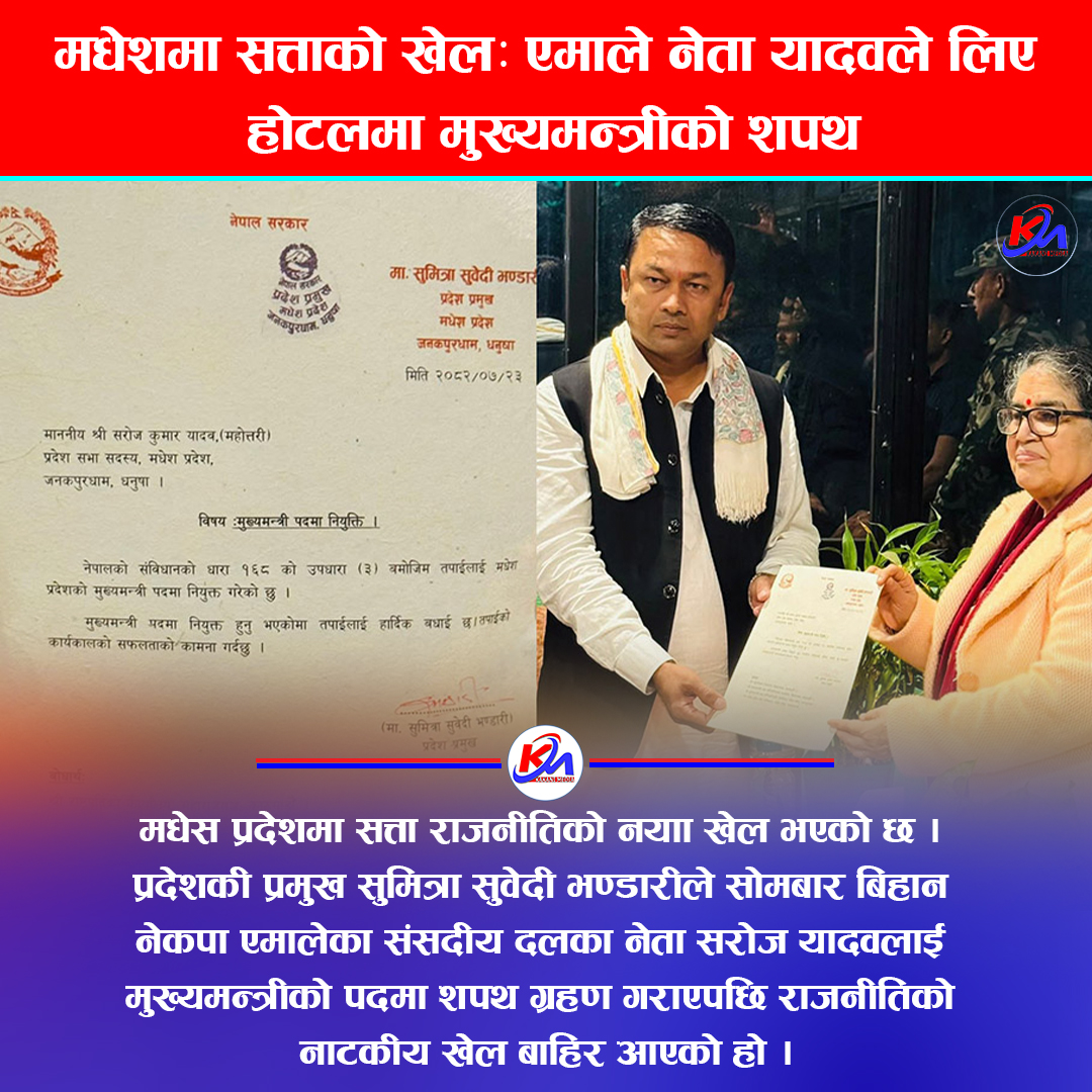 काठमाडौँ । मधेस प्रदेशमा सत्ता राजनीतिको नयाँ खेल भएको छ । प्रदेशकी प्रमुख सुमित्रा सुवेदी भण्डारीले सोमबार बिहान नेकपा एमालेका संसदीय दलका नेता सरोज यादवलाई मुख्यमन्त्रीको पदमा शपथ ग्रहण गराएपछि राजनीतिको नाटकीय खेल बाहिर आएको हो । विरामी भएको भन्दै काठमाडौँ हिडेकी प्रदेश प्रमुखले सिन्धुलीको एक होटलमा यादवलाई मुख्यमन्त्रीको शपथ गराएकी छन् । संविधानको धारा १६८ (३) बमोजिम यादव प्रदेश सभाको ठुलो दलको हैसियतमा मधेस प्रदेशको नयाँ मुख्यमन्त्री बनेका हुन् ।